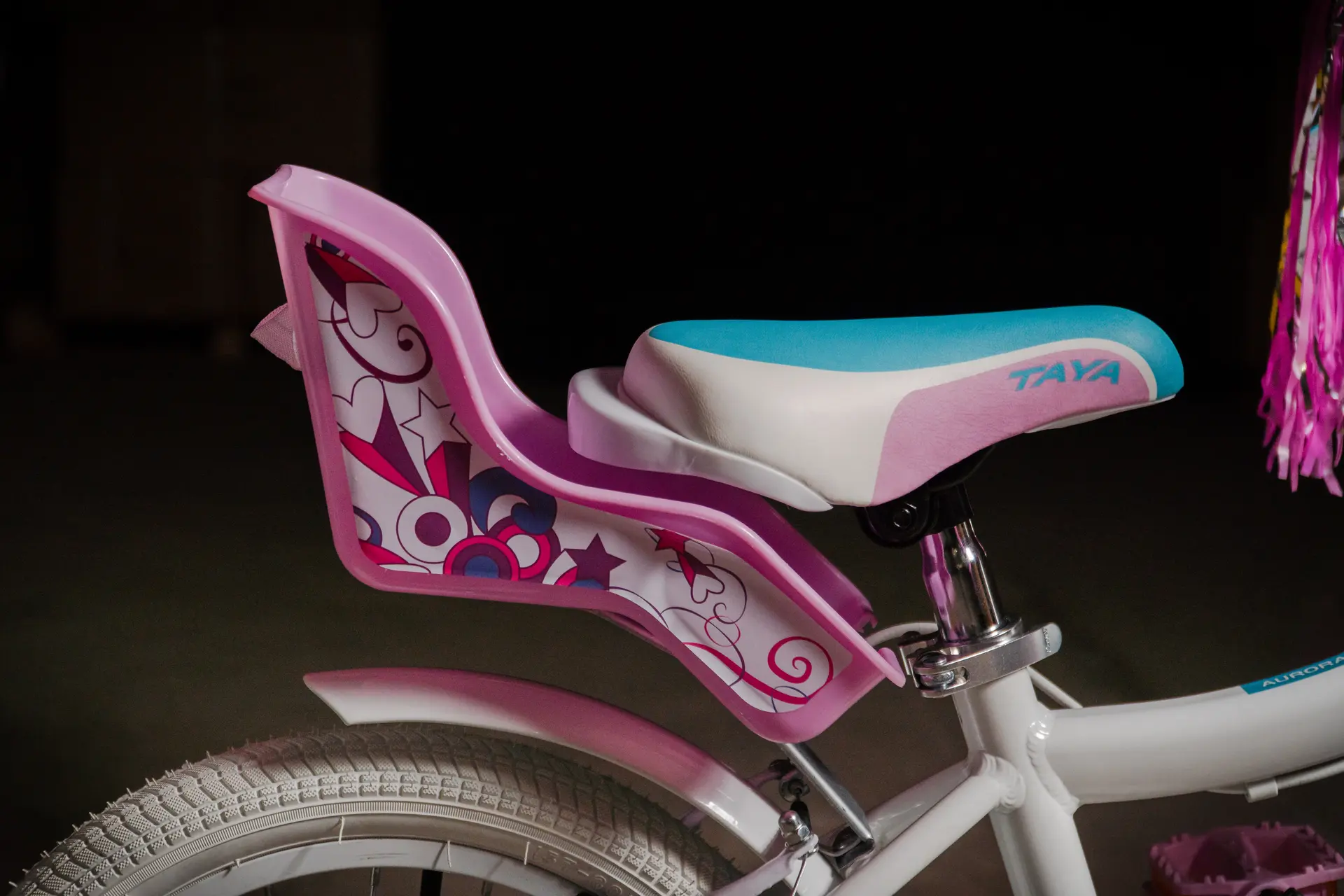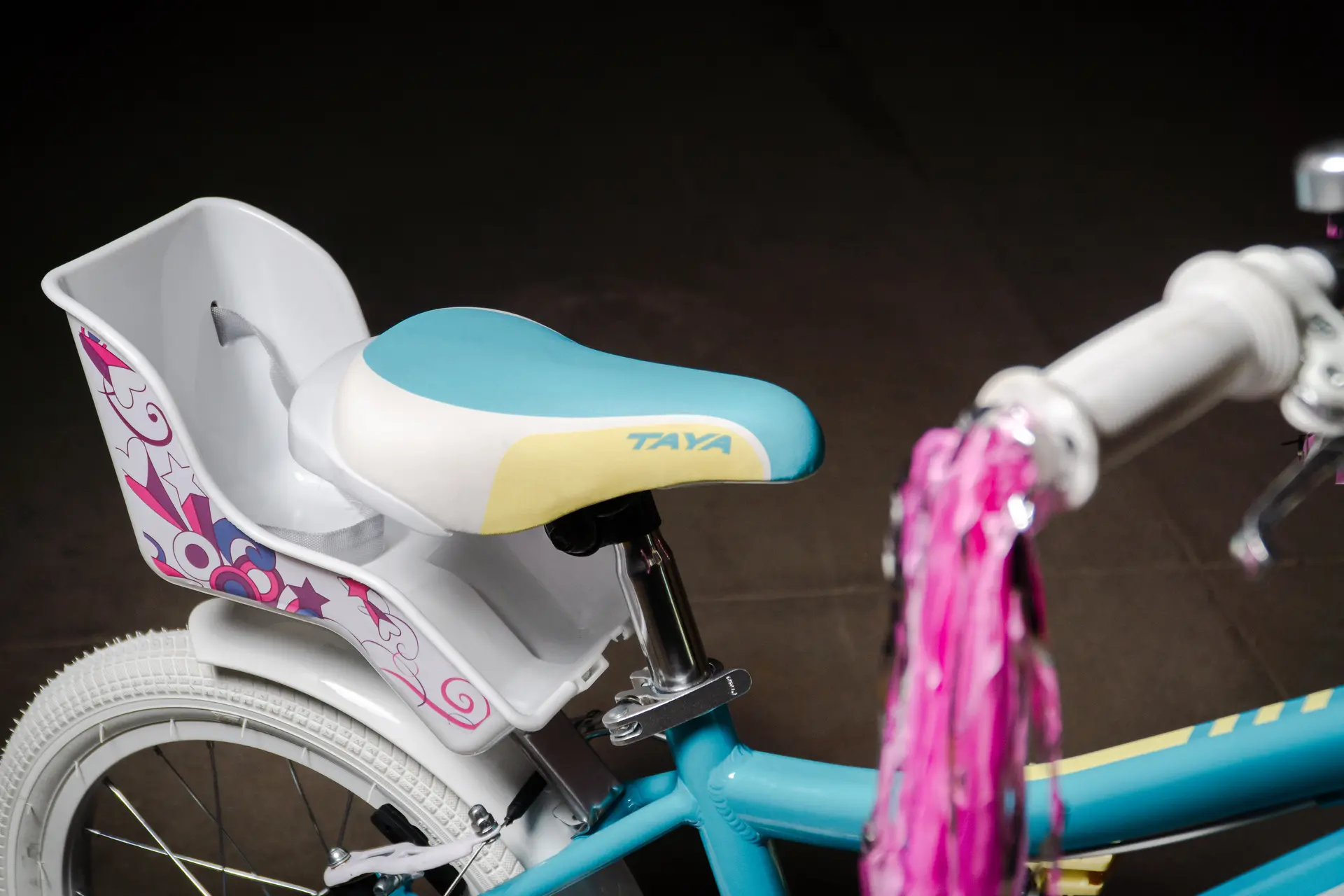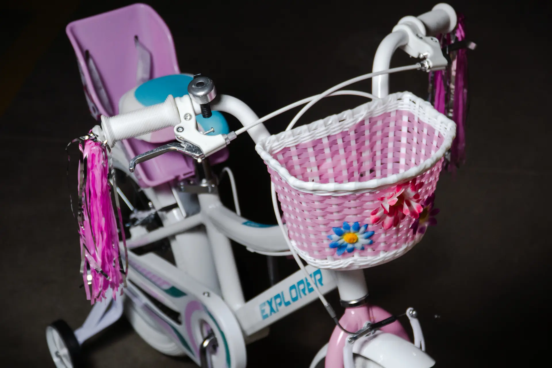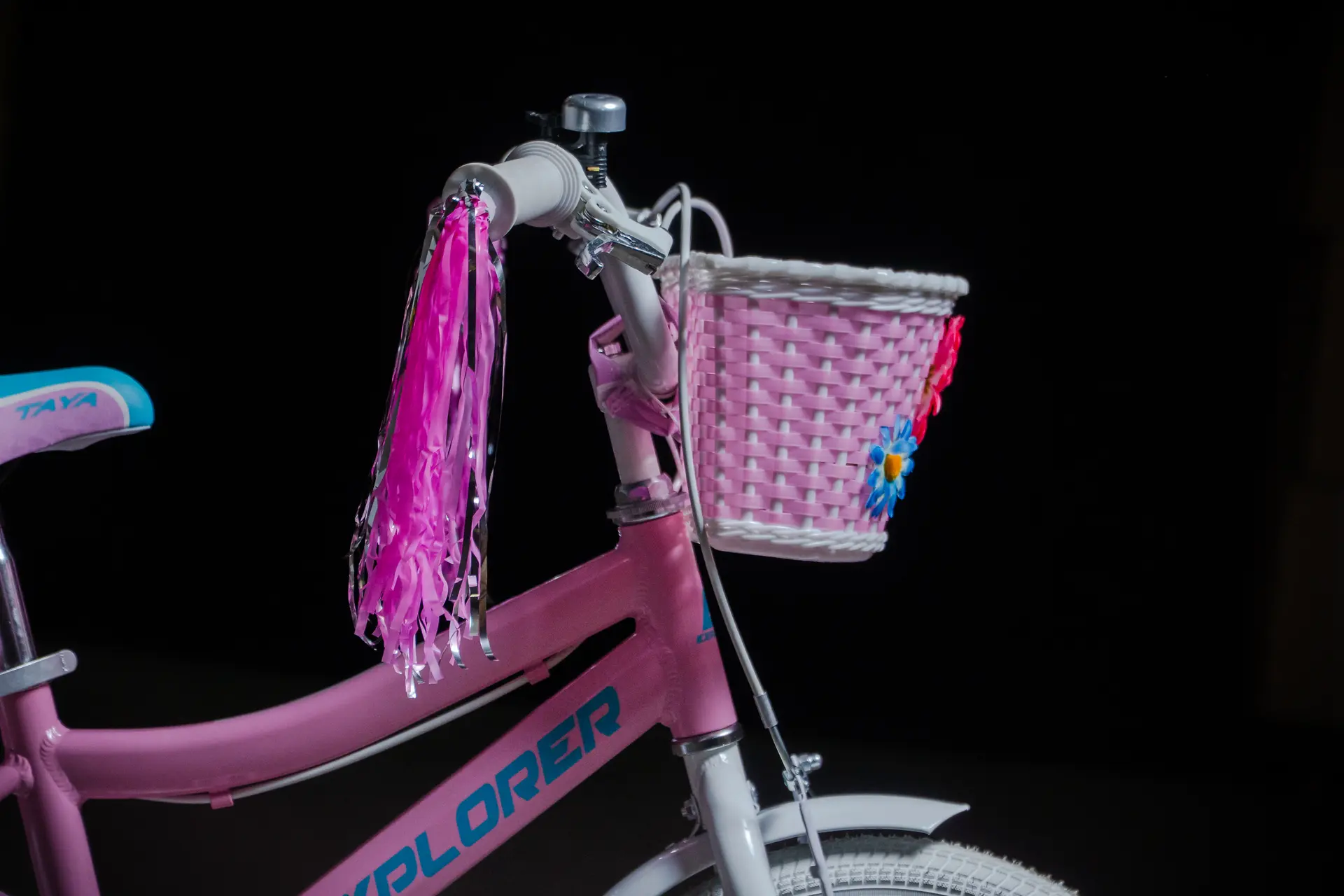 Incluye canasto plástico delantero, silla para muñecas, timbre, flecos de puño, rueditas de equilibrio laterales y protector de stem, todo lo necesario para pedalear cómoda y protegida.